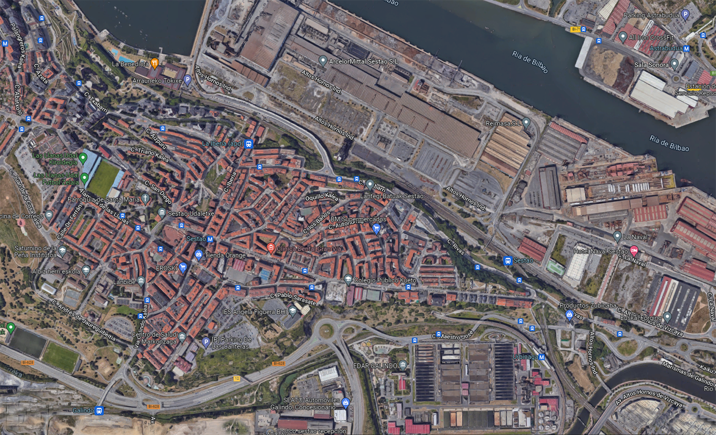 SESTAO es una entidad de Bizkaia, de población agrícola (incluso con txakoli) y ganadera en sus comienzos, hasta que la industrialización desatada a finales del siglo XIX ocupó la mitad de su pequeño territorio con empresas de siderurgia, metalurgia, navales y otras, ubicadas en la vega de San Nicolás, la Vega Vieja de Markonzaga y la Vega Nueva junto a la Ría del Nervión.